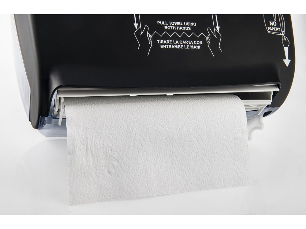 Plastový zásobník na papírové ručníky v roli s automatickým ořezem. Výkonný řezací mechanismus umožňuje plynulé dávkování po jednom útržku. Velká kapacita snižuje nutnost častého doplňování. Ideální pro rušné toalety např. ve školách, továrnách nebo na letištích. Polotransparentní okénko poskytuje dobrý přehled, kdy je třeba obsah doplnit.