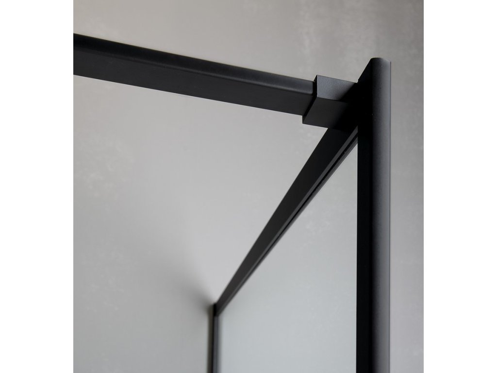 | Stabilitu zajišťuje kolmá vzpěra o délce 1000 mm. Její délku lze upravit na požadovaný rozměr. | Zevnitř je sklo dokonale hladké. Navíc je ošetřené vrstvou Coated Glass pro snadnou údržbu. | Industriální design je zdůrazněn hliníkovými profily v barvě černá mat, které lemují sklo. |