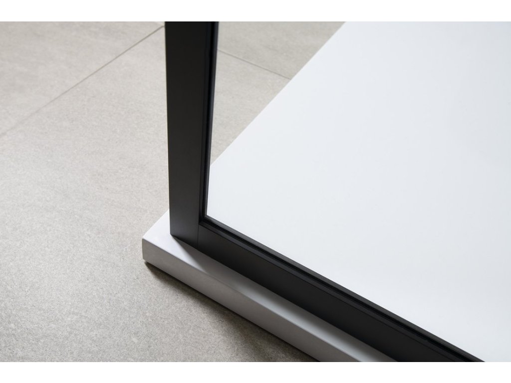 | Stabilitu zajišťuje kolmá vzpěra o délce 1000 mm. Její délku lze upravit na požadovaný rozměr. | Zevnitř je sklo dokonale hladké. Navíc je ošetřené vrstvou Coated Glass pro snadnou údržbu. | Industriální design je zdůrazněn hliníkovými profily v barvě černá mat, které lemují sklo. |