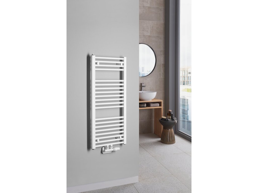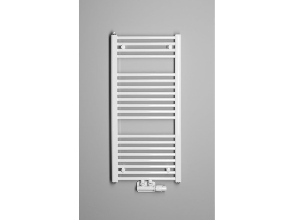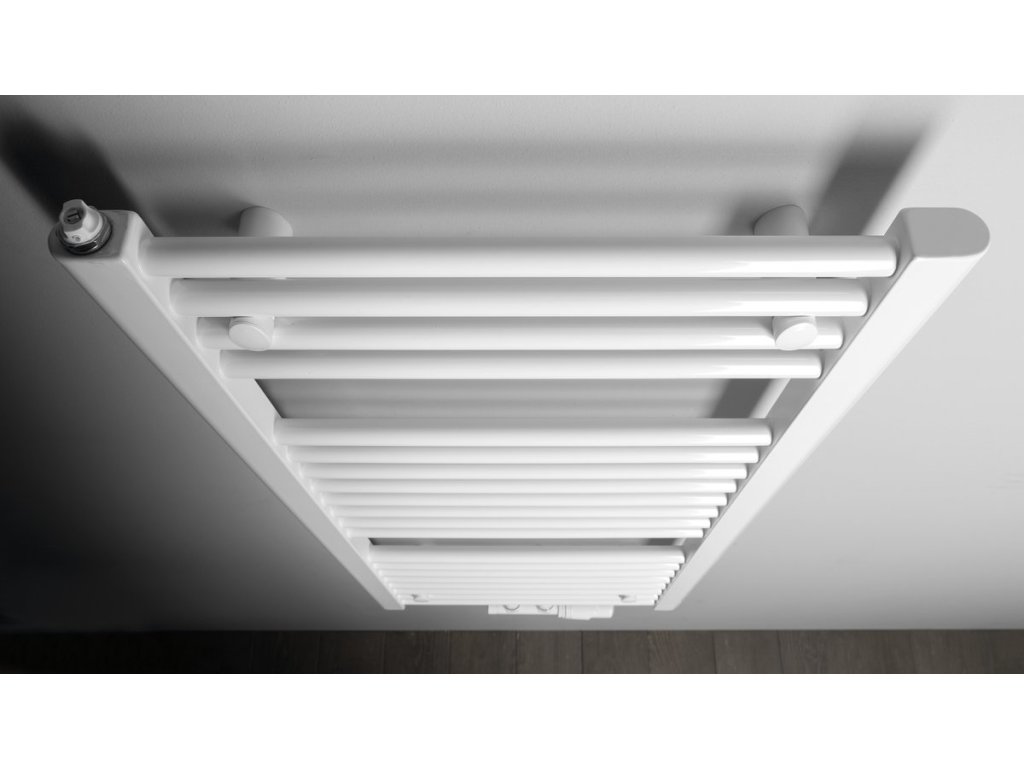 Tradičně tvarované otopné těleso z ocelových trubek v bílém provedení s rovnými vodorovnými profily, středové připojení s roztečí 50 mm.