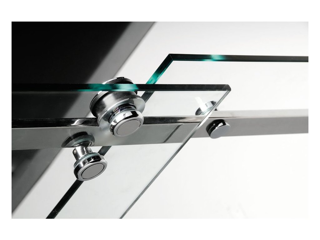 Dveře z bezpečnostního skla jsou zavěšeny a jejich pohyb usměrňuje vodící díl na podlaze. Je tak umožněn bezbariérový vstup.