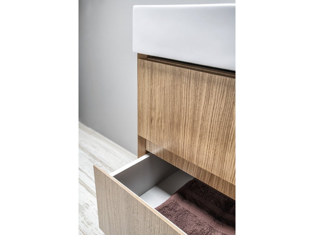 Dokonale decentní série koupelnového nábytku FILENA nabízí skříňky z dubové dýhy v přírodním provedení dekoru dřeva ošetřeném transparentním lakem, v bílém matném lakování a v černě matném lakovaném drážkovaném designu. Ostré zkosené hrany pod úhlem 45° čel zásuvek a dvířek vytváří tenkou linii, která je pro sérii charakteristická. Čistý design není rušen úchytkou, pohodlné otevírání umožňuje zkosená hrana a otvor mezi zásuvkami.