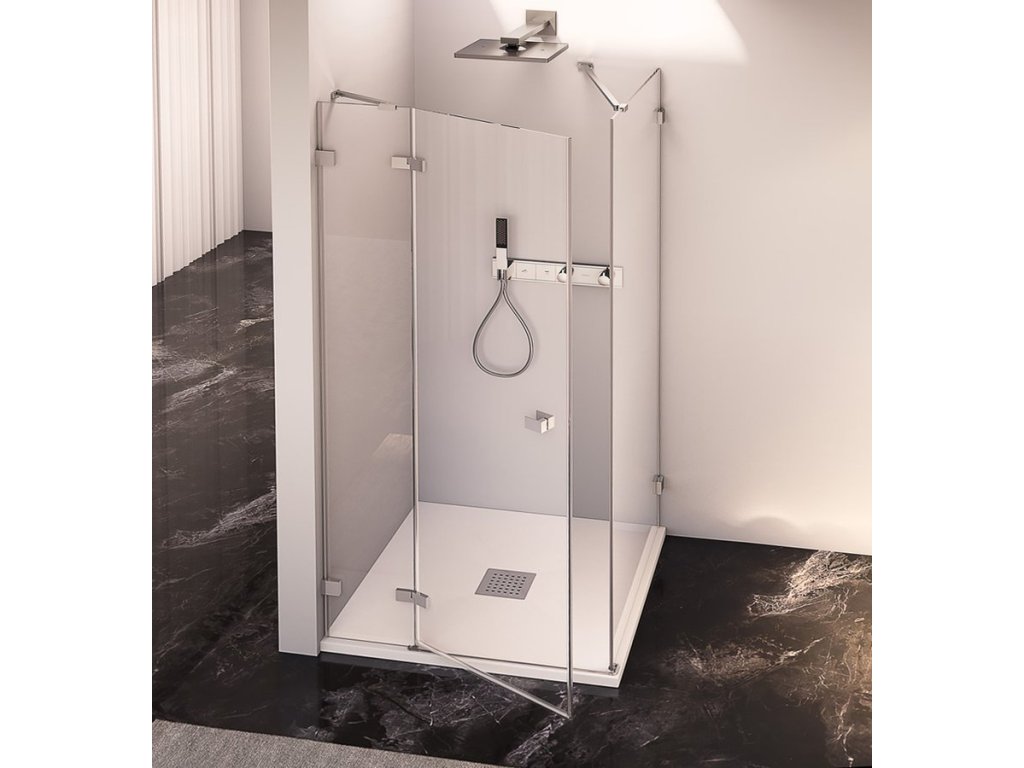 Bezprofilové pantové zástěny FORTIS EDGE v moderním hranatém designu. Minimalistické pochromované panty v nekompromisním hranatém designu, zevnitř zapuštěné pro snadné čištění a se zvedací funkcí pro pohodlné otevírání. Bezpečnostní čiré sklo v tloušťce 8 mm je ošetřené povrchovou úpravou ANTIDROP pro snadné čištění. Výška 2000 mm. Hranaté pochromované madlo ve stejném minimalistickém designu jako panty.