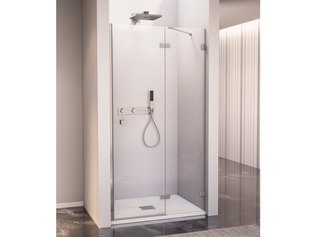Bezprofilové pantové zástěny FORTIS EDGE v moderním hranatém designu. Minimalistické pochromované panty v nekompromisním hranatém designu, zevnitř zapuštěné pro snadné čištění a se zvedací funkcí pro pohodlné otevírání. Bezpečnostní čiré sklo v tloušťce 8 mm je ošetřené povrchovou úpravou ANTIDROP pro snadné čištění. Výška 2000 mm. Hranaté pochromované madlo ve stejném minimalistickém designu jako panty.