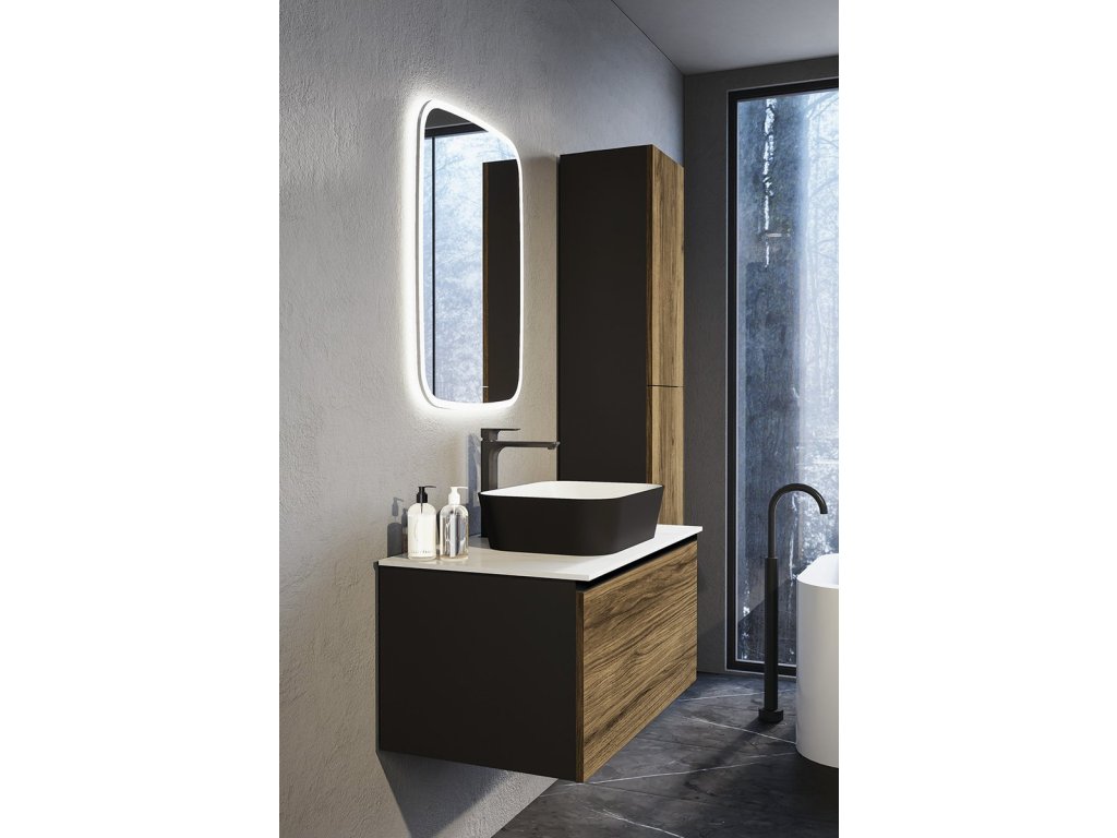 Uvnitř skříňky je nad zásuvkou praktická police na drobnosti každodenní potřeby. Pod hranu umyvadla lze instalovat tlumené LED osvětlení, které pro jeho nízkou spotřebu (1W) není nutné vypínat.