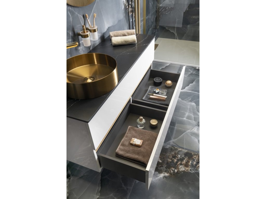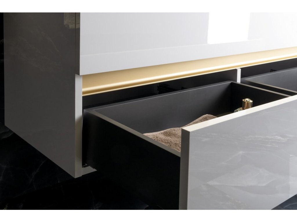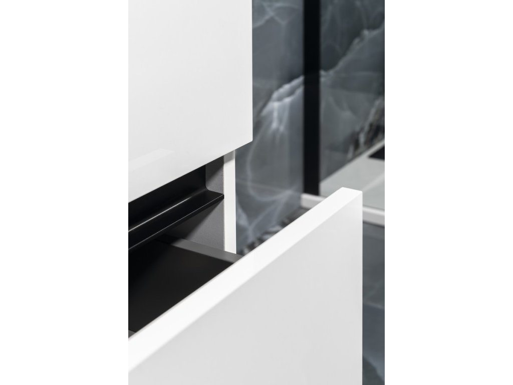 Série ODETTA nabízí umyvadlové skříňky v kombinaci se 3 druhy umyvadel - keramická KARE, z litého mramoru GODIVA a betonová QUADRADO. Série je také navržena pro vybraná umyvadla na postavení. Rozměrovou variabilitu umožňuje kombinace umyvadlových a spodních skříňek. Bezúchytkové zásuvky jsou vybaveny výsuvy BLUM s tlumeným dovíráním. Horní zásuvka je bez výřezu pro sifon, čímž se zvyšuje úložná plocha zásuvky. Mezi zásuvkami je hliníková lišta CHANEL v černé nebo bílé barvě. Na přání lze dodat lištu i ve zlaté barvě.