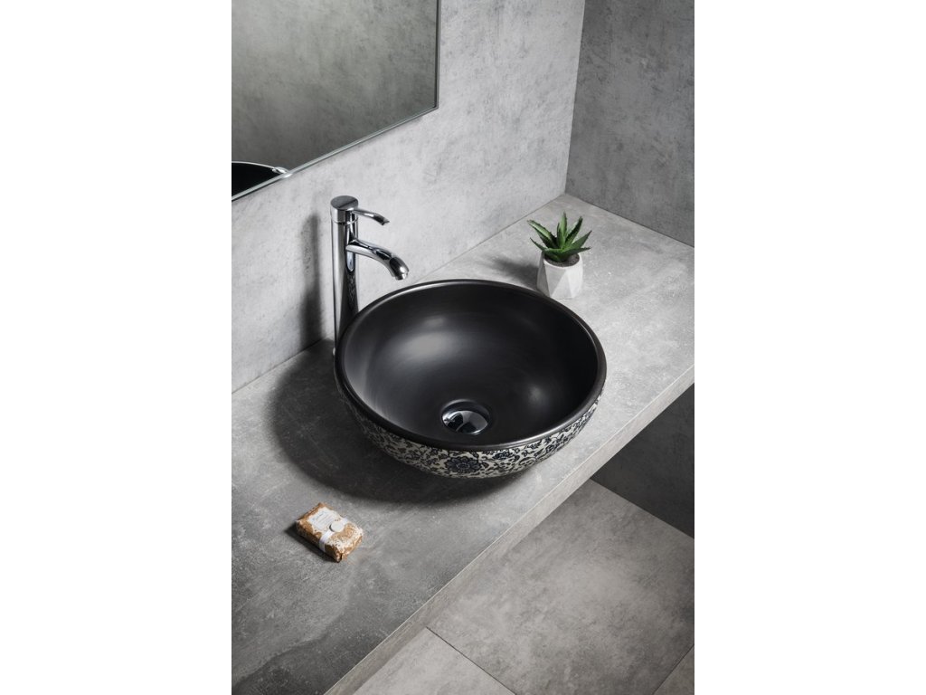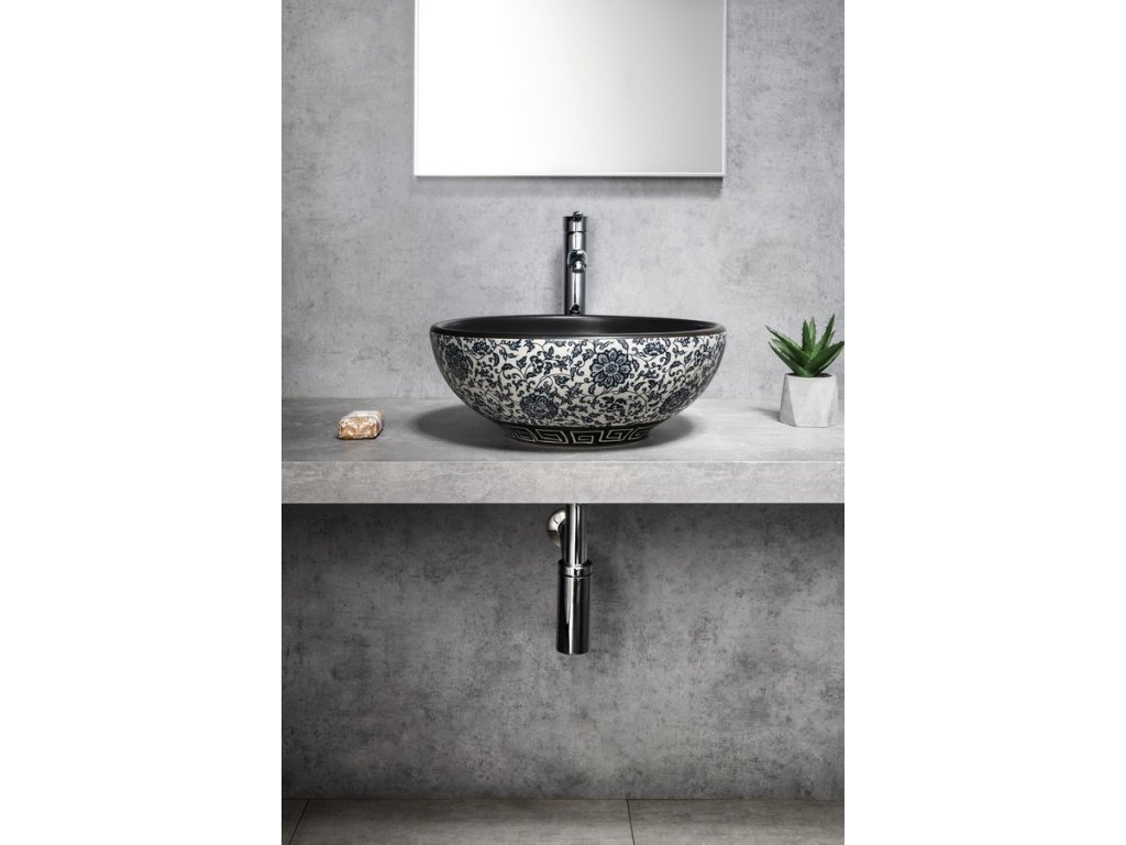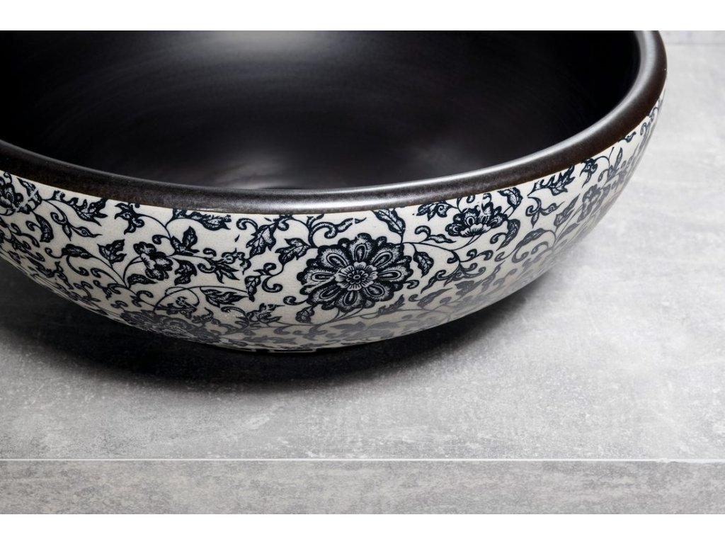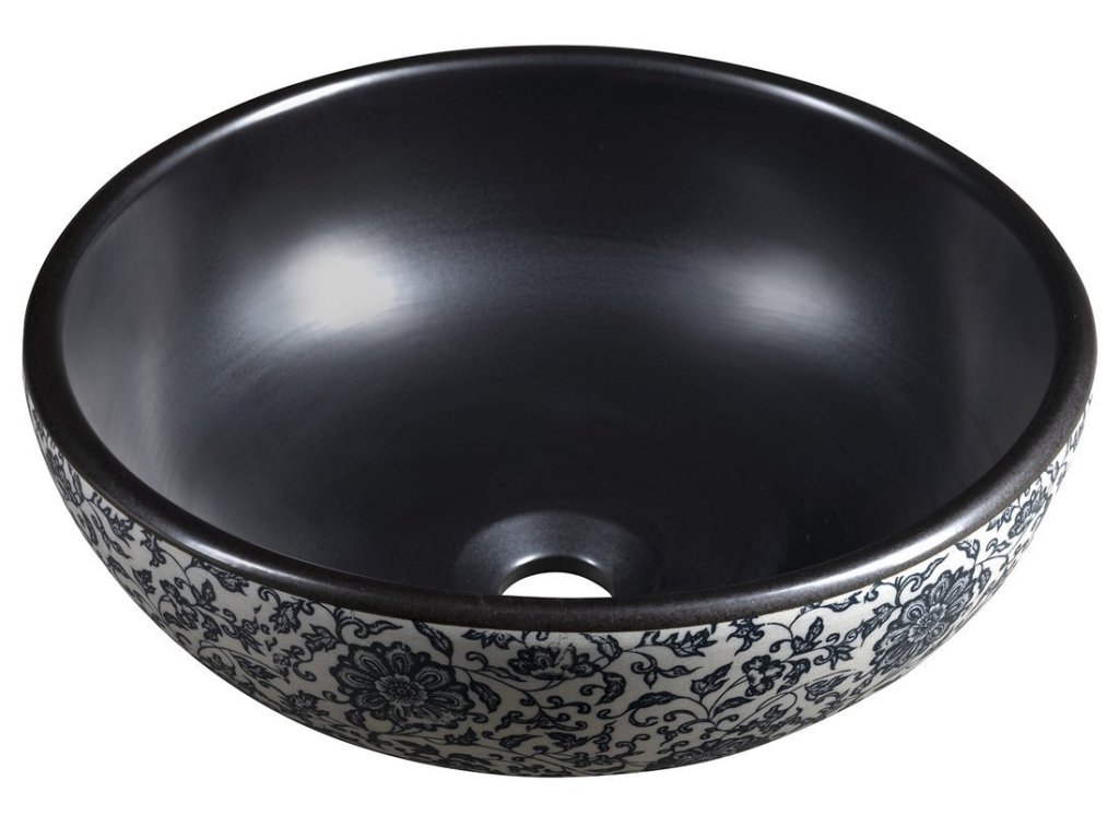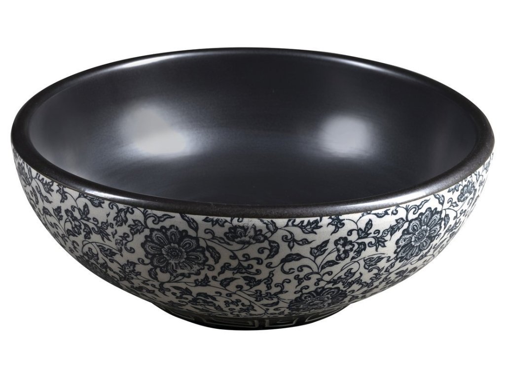 PRIORI keramické umyvadlo na desku, Ø 41cm, černá s modrým vzorem