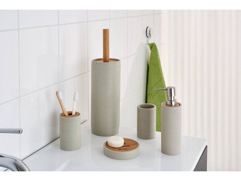 Jednoduché zdobení jemnými vodorovnými drážkami, kombinace s bambusem a tlumené zemité barvy si přímo říkají o umístění doplňků ROLLER do koupelny zařízené v přírodním stylu.