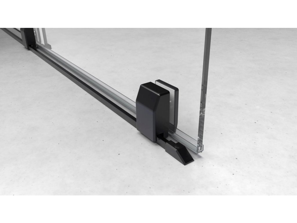 Dvojdílná zástěna, tvořená pevnou a posuvnou částí. Posuvná část se pohybuje na ložiskových kolech po tenké kolejnici, která zároveň tvoří přetokovou lištu. Šířka je nastavitelná zkrácením kolejnice a umístěním koncového dorazu na kolejnici i na skle.