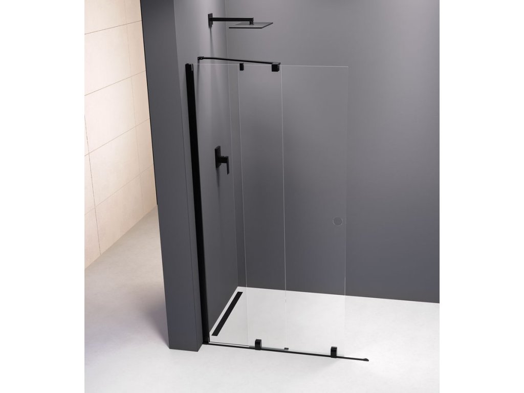 - Dvojdílné sprchové dveře do prostoru (pevná a posuvná část) s hliníkovými profily v chromu nebo matně černé povrchové úpravě