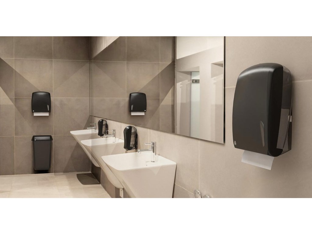 Kolekce SKIN pro veřejné prostory zahrnuje kompletní výběr koupelnových doplňků, které se vyznačují moderním designem. Doplňky v barevném provedení černá a písková jsou vyrobeny z recyklovaného plastu.