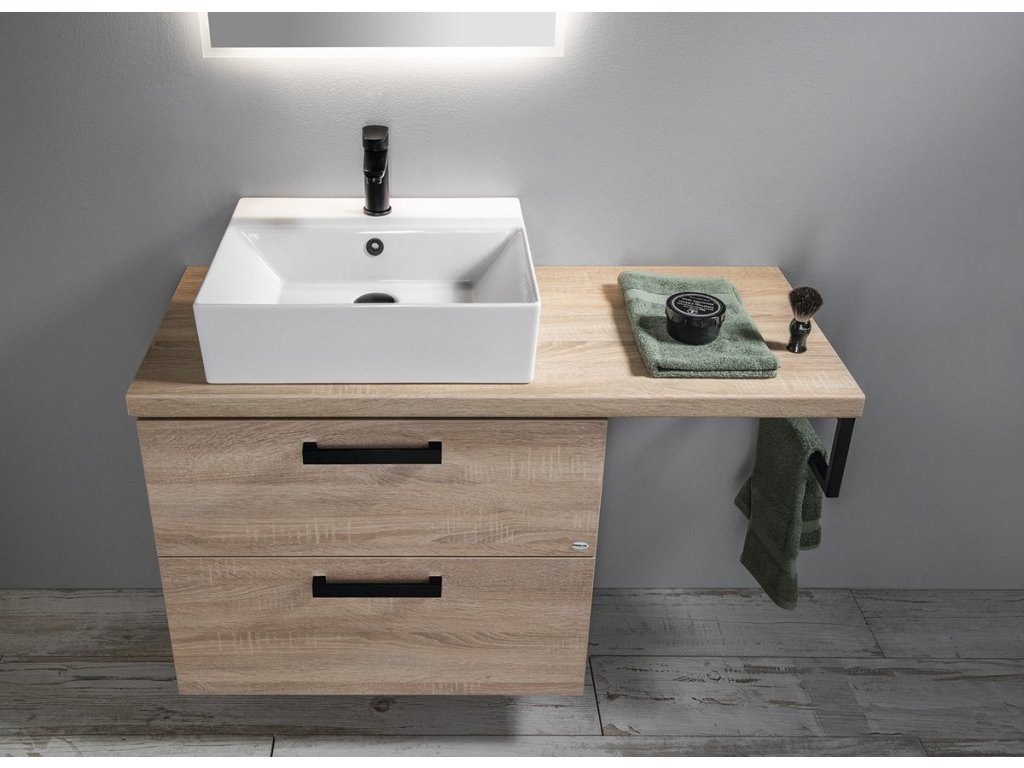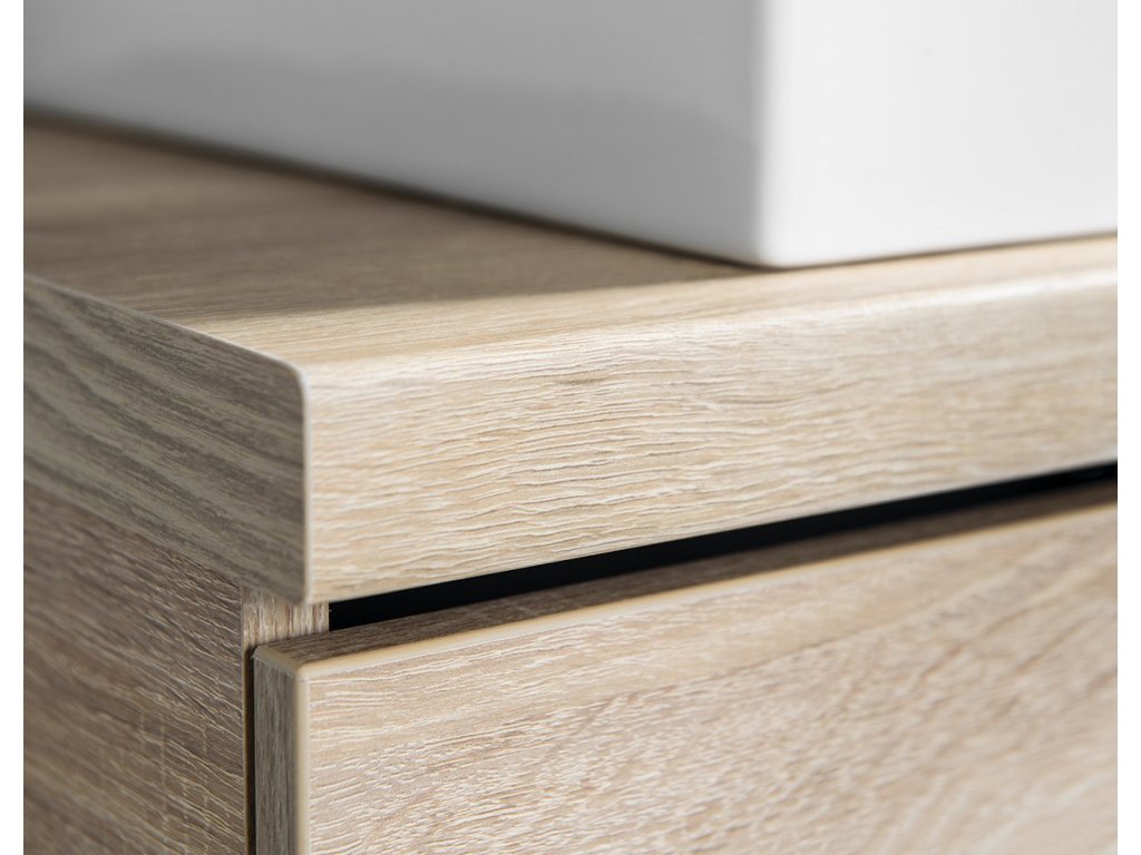 Koupelnový nábytek VEGA s deskou VEGA (HPL) v dekoru dub platin lze kombinovat s umyvadly na postavení.