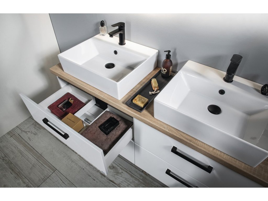 Koupelnový nábytek VEGA s deskou VEGA (HPL) v dekoru dub platin lze kombinovat s umyvadly na postavení.