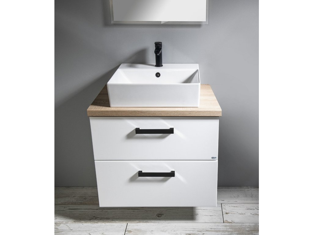 Koupelnový nábytek VEGA s deskou VEGA (HPL) v dekoru dub platin lze kombinovat s umyvadly na postavení.